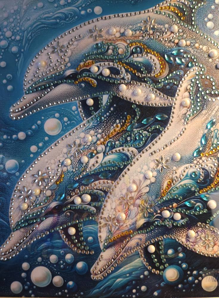 Each dolphin is intricately designed, showcasing their graceful movements and joyful spirit. The vibrant colors of the rhinestones are carefully selected to reflect the beauty of the ocean, making this piece not just art, but a celebration of marine life. The Rhinestone Art technique adds depth and texture, ensuring that this artwork stands out on any wall.