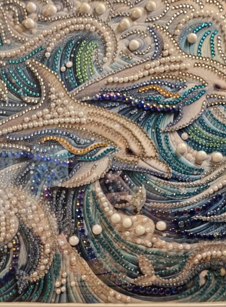 Measuring 12x12 inches, this framed art piece is not just a decoration; it's a statement of your love for marine life and creativity. The vibrant colors and intricate details of the dolphins will transport you to the serene waters where these magnificent creatures play. Whether you're an ocean lover, a collector of unique art, or simply looking to add a touch of whimsy to your decor, this Rhinestone Art is sure to impress.