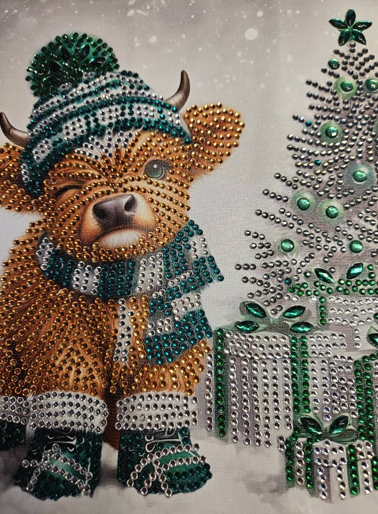 Bring a touch of festive charm to your home this season with our Holiday Highland Wooly Cow 12x12 Framed Rhinestone Art. This delightful piece captures the essence of Christmas with its whimsical design, featuring a fluffy Highland cow adorned with sparkling rhinestones that catch the light beautifully. Perfect for adding a pop of color and personality to your holiday decor, this framed art piece is sure to be a conversation starter at your gatherings.